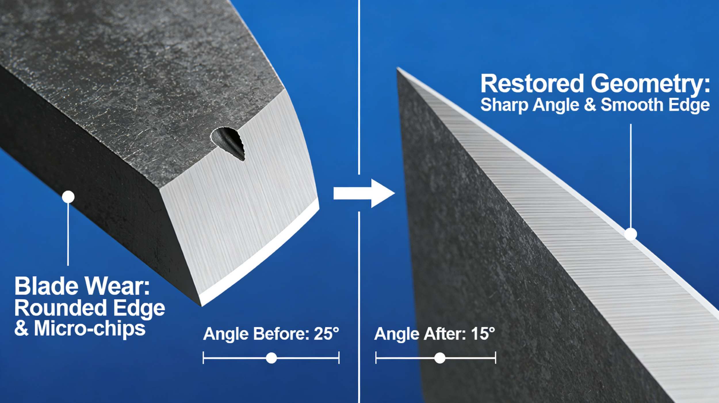 Avec le temps, les lames s'usent progressivement, leur tranchant s'émousse, ce qui augmente la force de coupe, la formation de bavures sur les produits et la consommation d'énergie. Un affûtage professionnel régulier permet non seulement de restaurer le tranchant, mais aussi de corriger les petites déformations, garantissant ainsi une précision de coupe optimale.