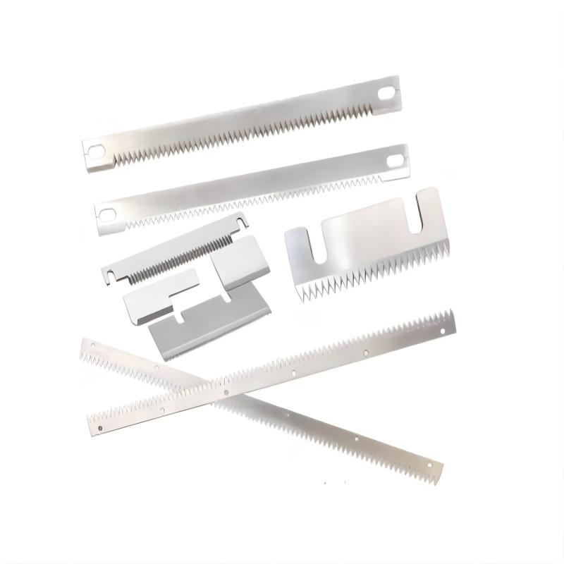 Les lames dentelées pour machines d'emballage, également appelées couteaux de découpe ou lames dentelées, doivent leur nom à la forme régulière de leurs dents. Contrairement aux lames lisses classiques, les lames dentelées permettent une coupe nette et uniforme grâce à leur incision dentelée, évitant ainsi les problèmes de bavures et de déchirures irrégulières.